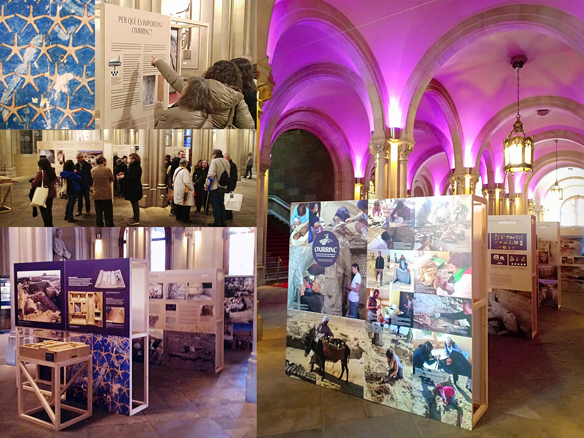 OXIRRINC. El llegat del nostre passat. Així és com es titula el darrer projecte expositiu que he dissenyat, a més de realitzar el disseny gràfic, per la Universitat de Barcelona, per encàrrec del Vicerectorat de Patrimoni i Activitats Culturals. De nou la UB m’ha confiat el donar forma a un projecte de temàtica ben atractiva, visitable en una ubicació especial com és el vestíbul històric de la Universitat a la Gran Via. Trenta anys d’excavacions arqueològiques a Egipte es mereixien una exposició així, per les sorprenents descobertes anuals d’èpoques molt diverses que realitza el multidisciplinari equip humà i totes les institucions implicades. La mostra és una manera de divulgar la importància de les troballes i l’estudi que realitza la UB en aquest indret, posant-lo en valor, com testimonien també les publicacions científiques editades. L’equip arqueològic encapçalat per la Dra. Maite Mascort i la Dra. Núria Castellano, han estat les encarregades de comissariar aquesta exposició, redactant i sintetitzant tots els continguts del recorregut, treballant en col·laboració amb Pili Mateo del Vicerectorat de la Universitat.